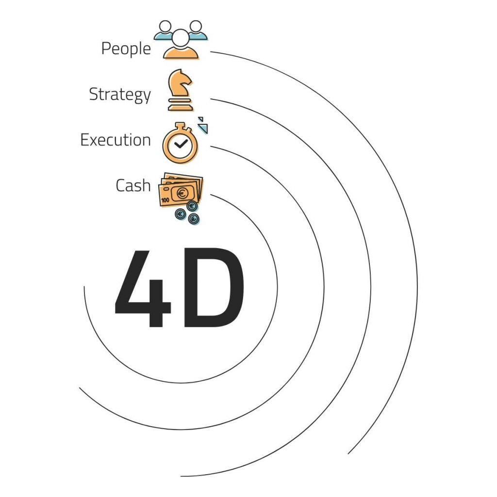 Das Framework besteht aus vier Handlungsfelder. Wir nennen es “Das 4D-Framework“ (D steht in dem Fall für Decision) und unterteilen es in die vier relevantesten Themen für wachsende Firmen: PEOPLE, STRATEGY, EXECUTION und CASH.