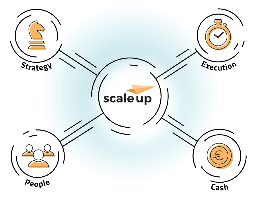 Das scale up Framework bietet dir dafür eine klare Struktur in vier entscheidenden Unternehmensbereichen: People, Strategy, Execution und Cash.